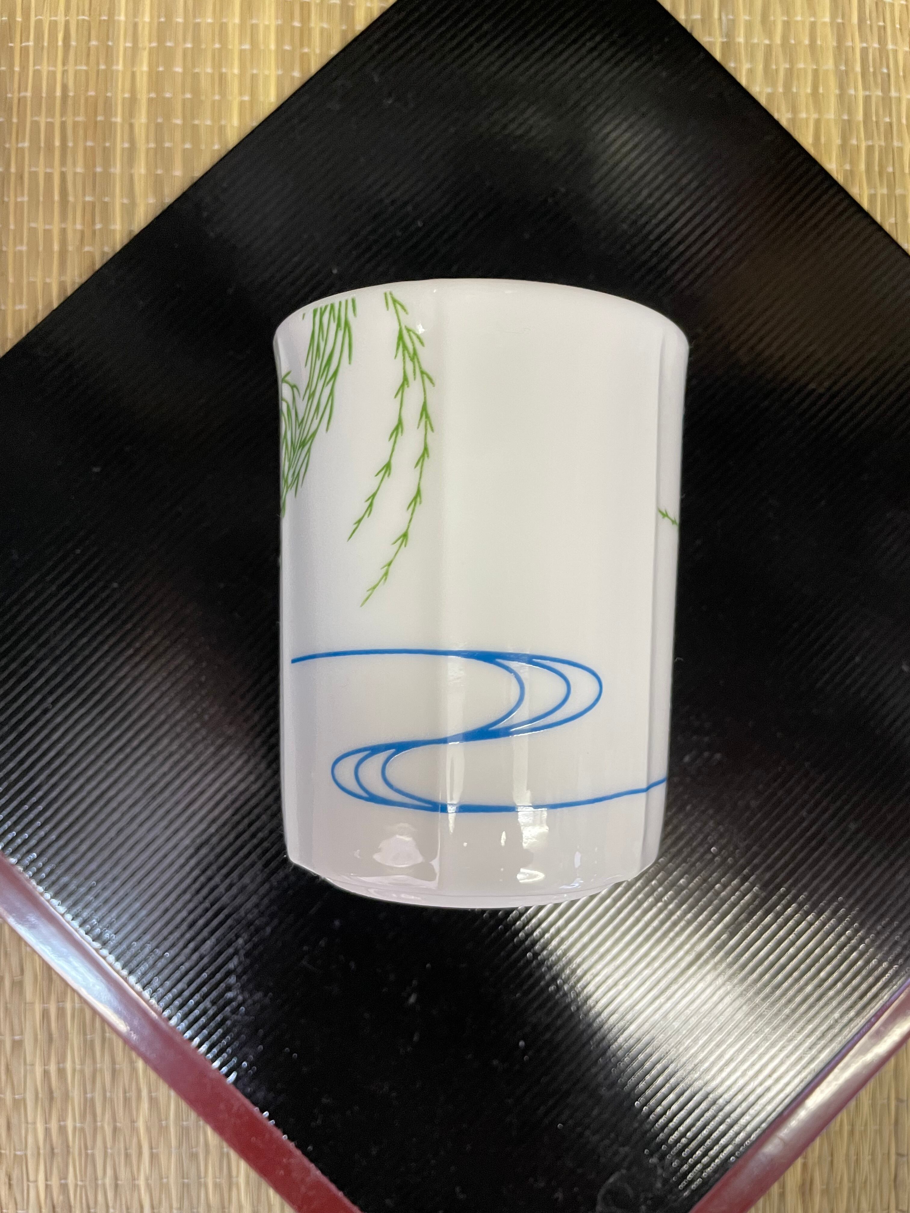 結び柳に流水、白地に草色の柳柄に青の流水柄、内側にも柳柄が描かれています。