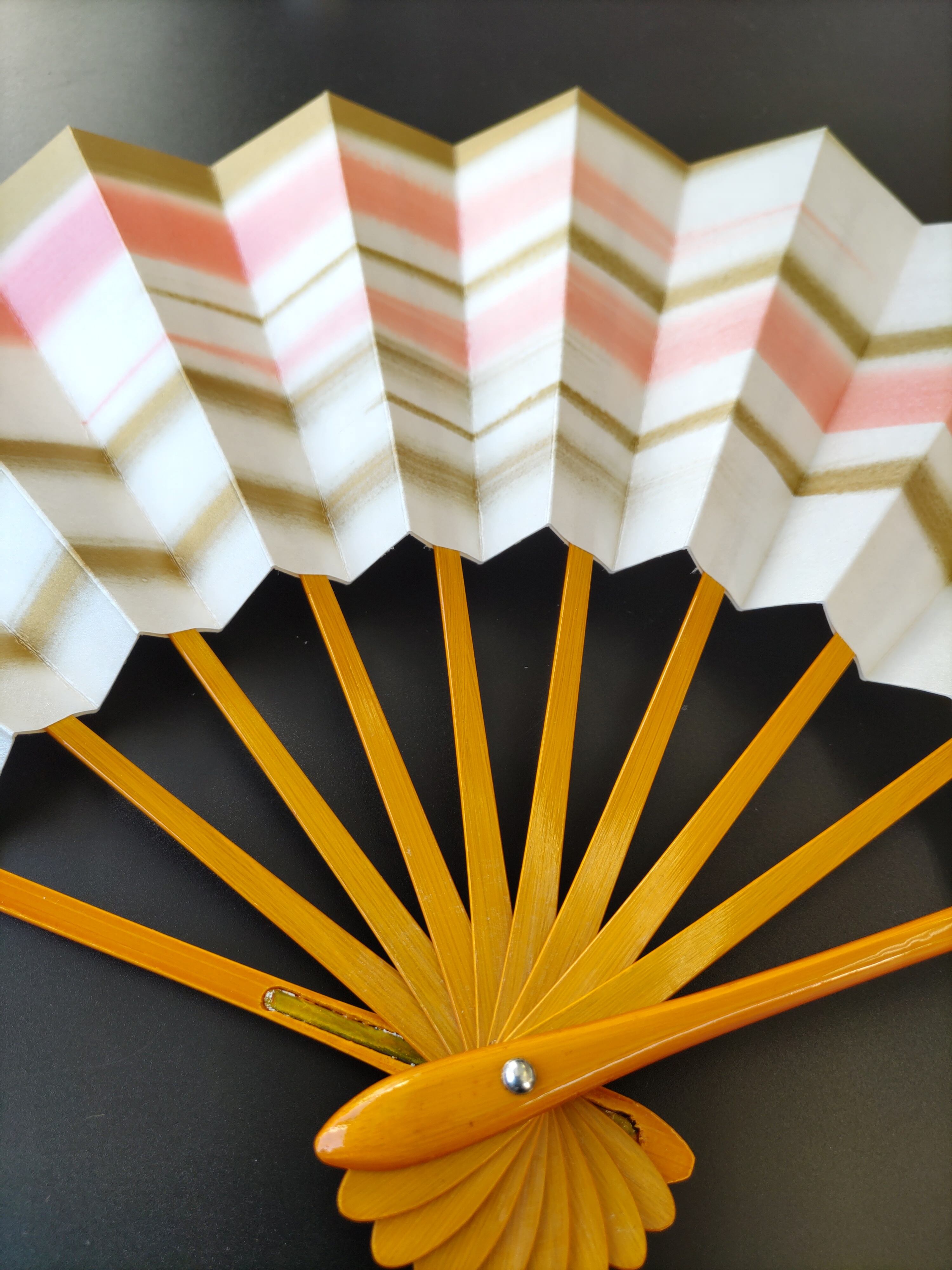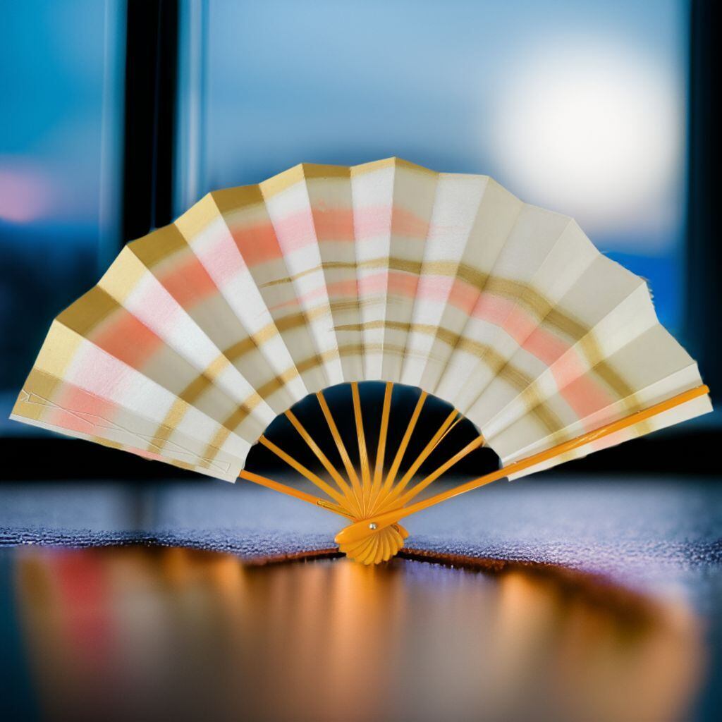 当店オリジナル舞扇、ほのかなピンク色に近い朱色と優しい色合いの金色での霞柄。お着物、演目に合わせやすい上品な舞扇です♪両面同柄で骨は春ケイ。