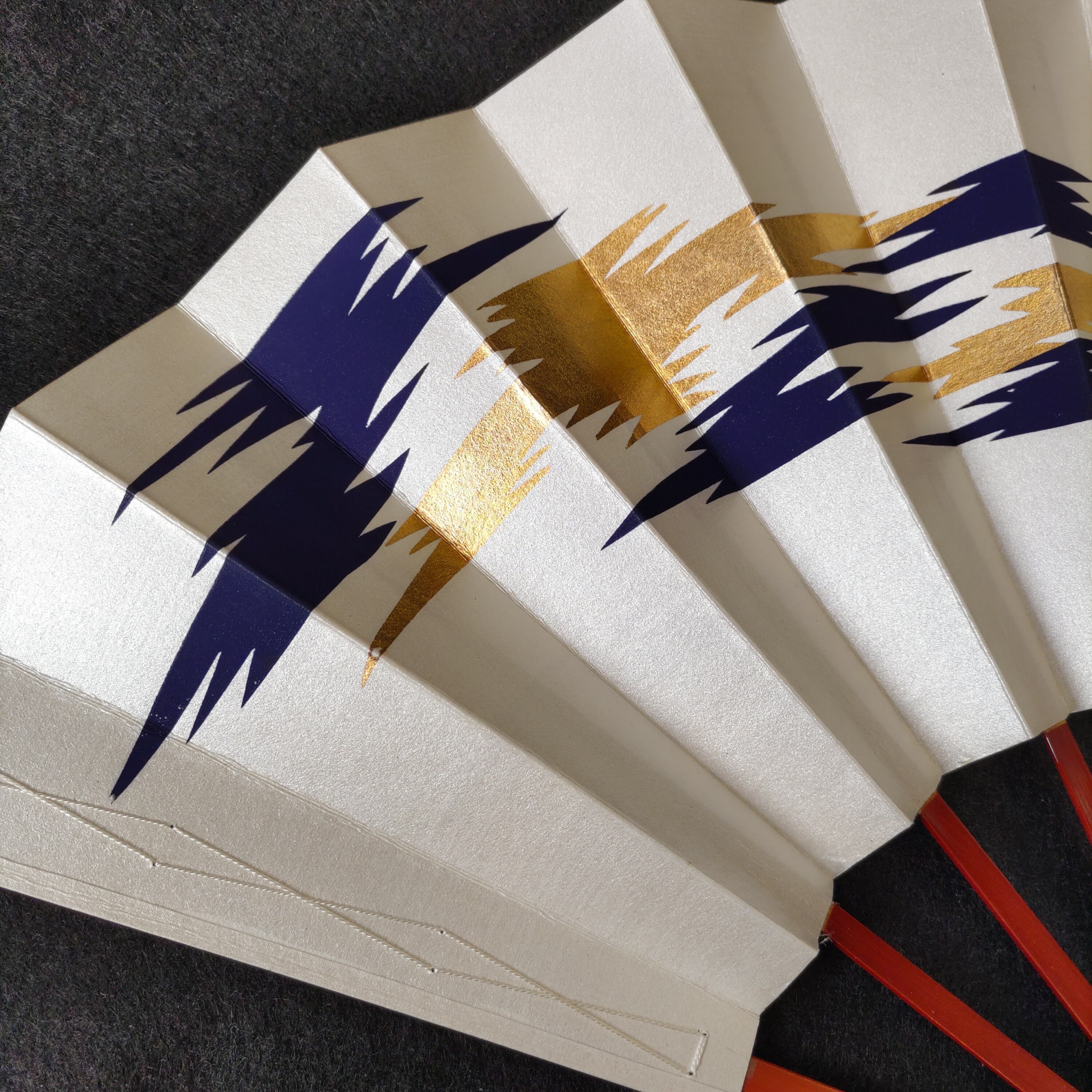 当店オリジナル舞扇、白地に金色と紺色で霞が入った柄のお扇子です♪両面同柄で骨はタメヌリ。