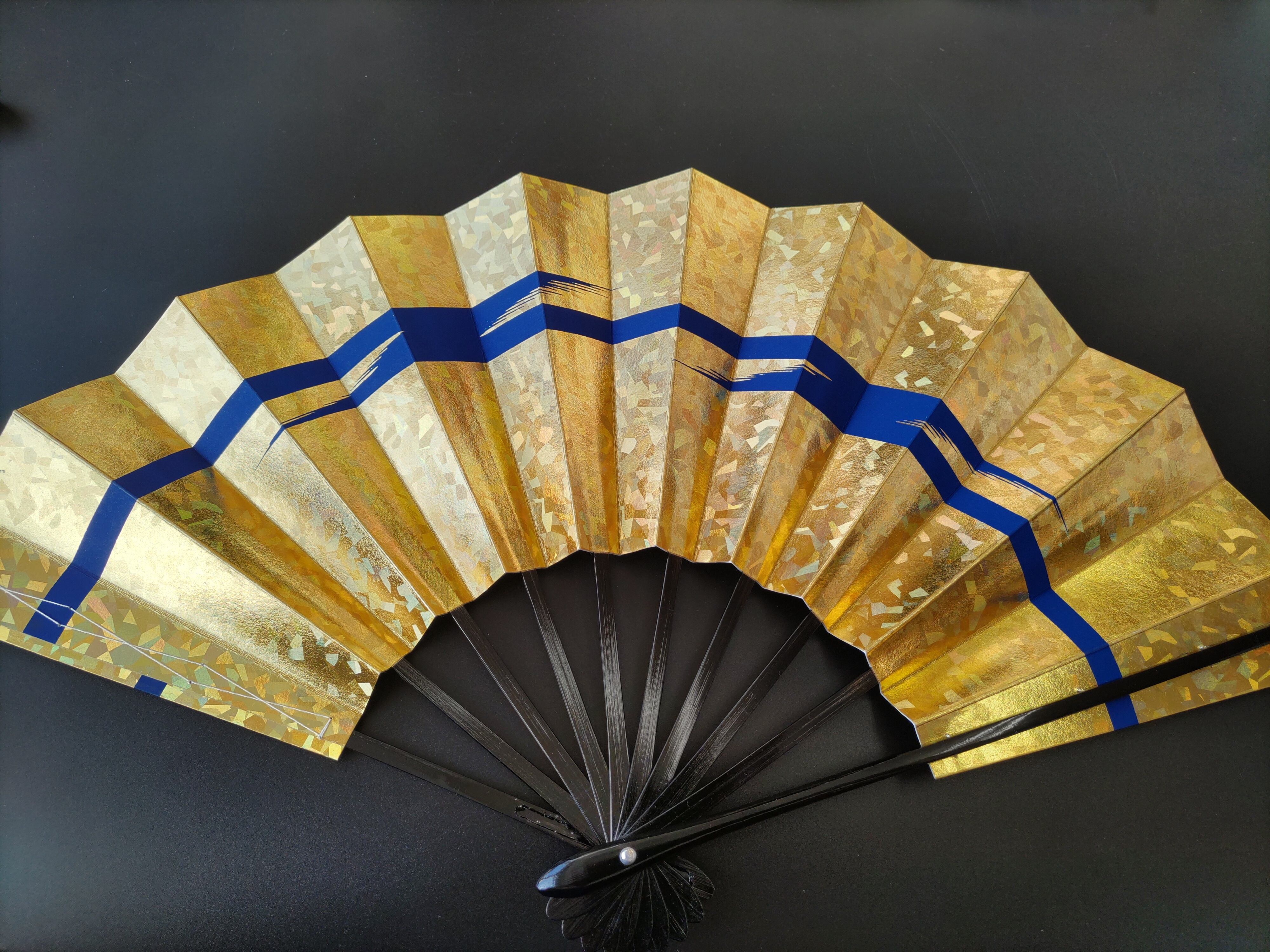 キラキラとした金色に紺の霞が1本入った、両面同柄のお扇子です。サイズは9寸5分の大きさ(約29cm)で、お稽古、舞台でご使用いただける商品です。プレゼントにもどうぞ♪当店オリジナル舞扇で骨は黒ヌリ。