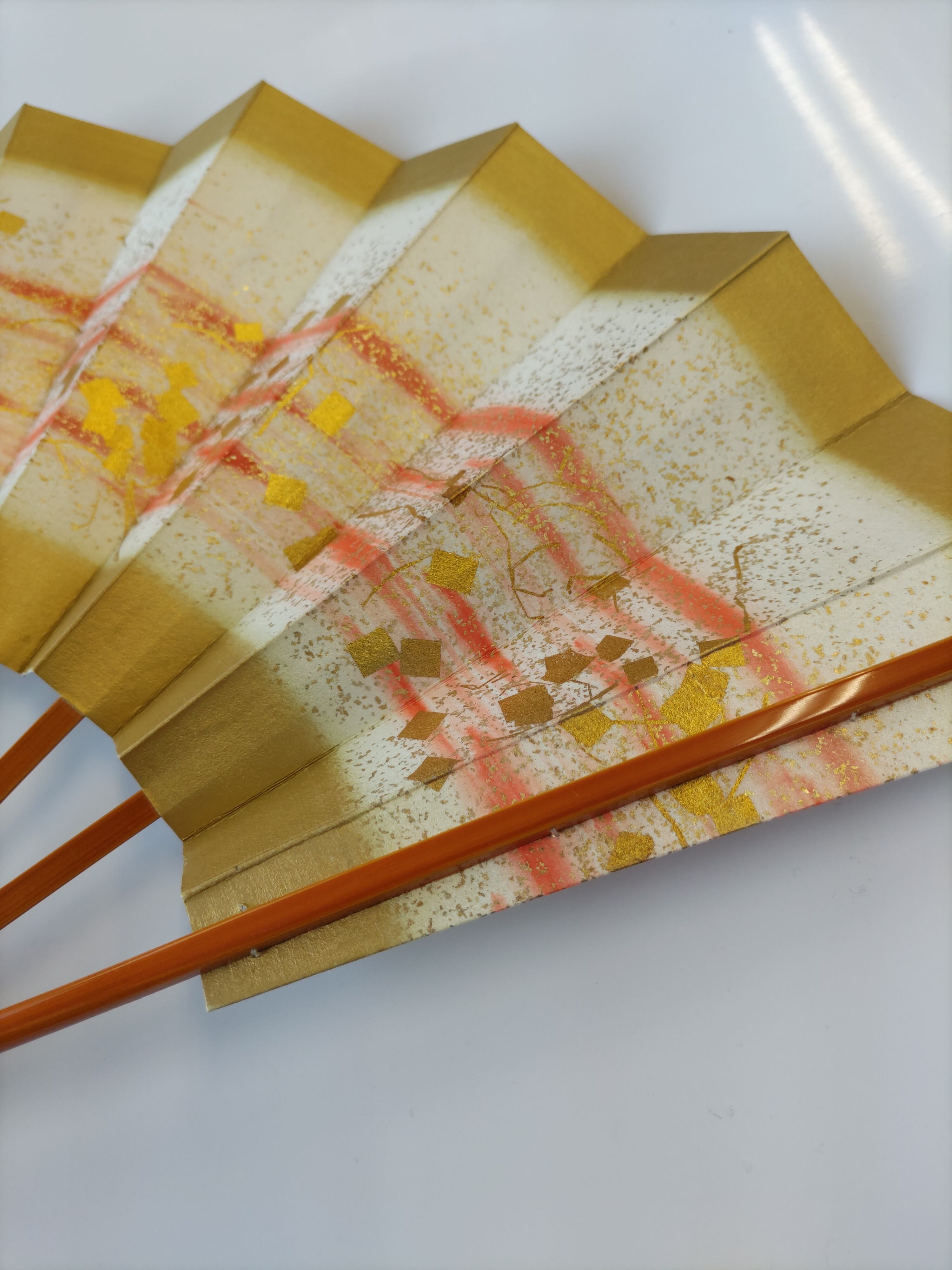 天地金の中に綺麗な朱色の霞が入った、両面同柄のお扇子です。サイズは9寸5分の大きさ(約29cm)で、お稽古、舞台でご使用いただける商品です。プレゼントにもどうぞ♪当店オリジナル舞扇で骨は春ケイ。