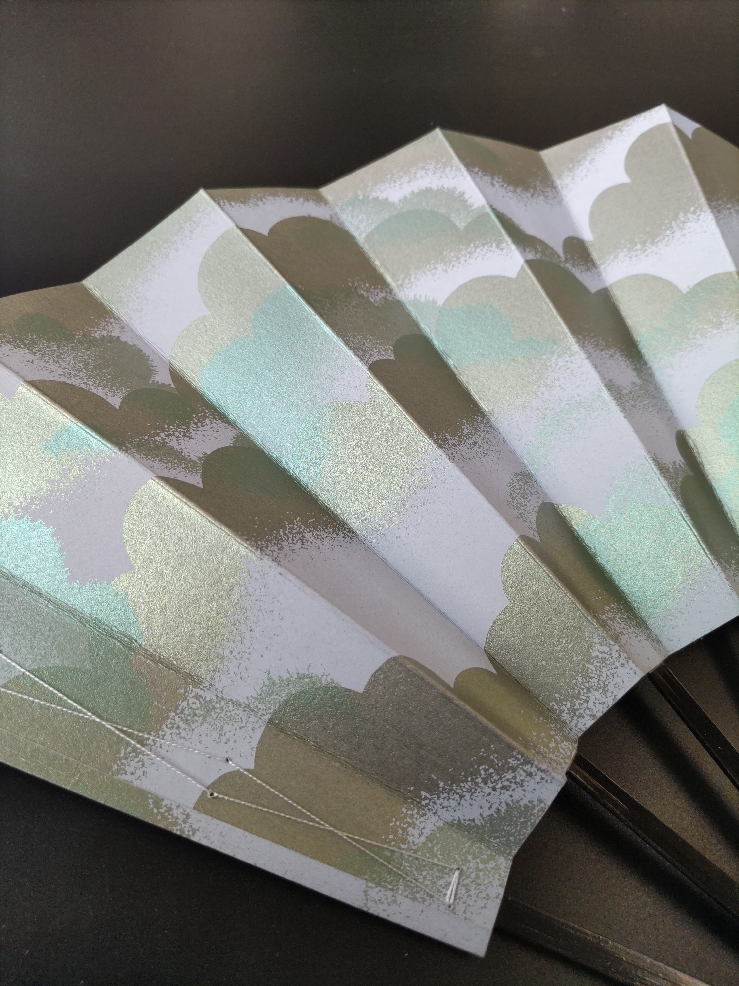 うっすらとした優しい草色の雲を重ねた、両面同柄のお扇子です。サイズは9寸5分の大きさ(約29cm)で、お稽古、舞台でご使用いただける商品です。プレゼントにもどうぞ♪当店オリジナル舞扇で骨は黒ヌリ。