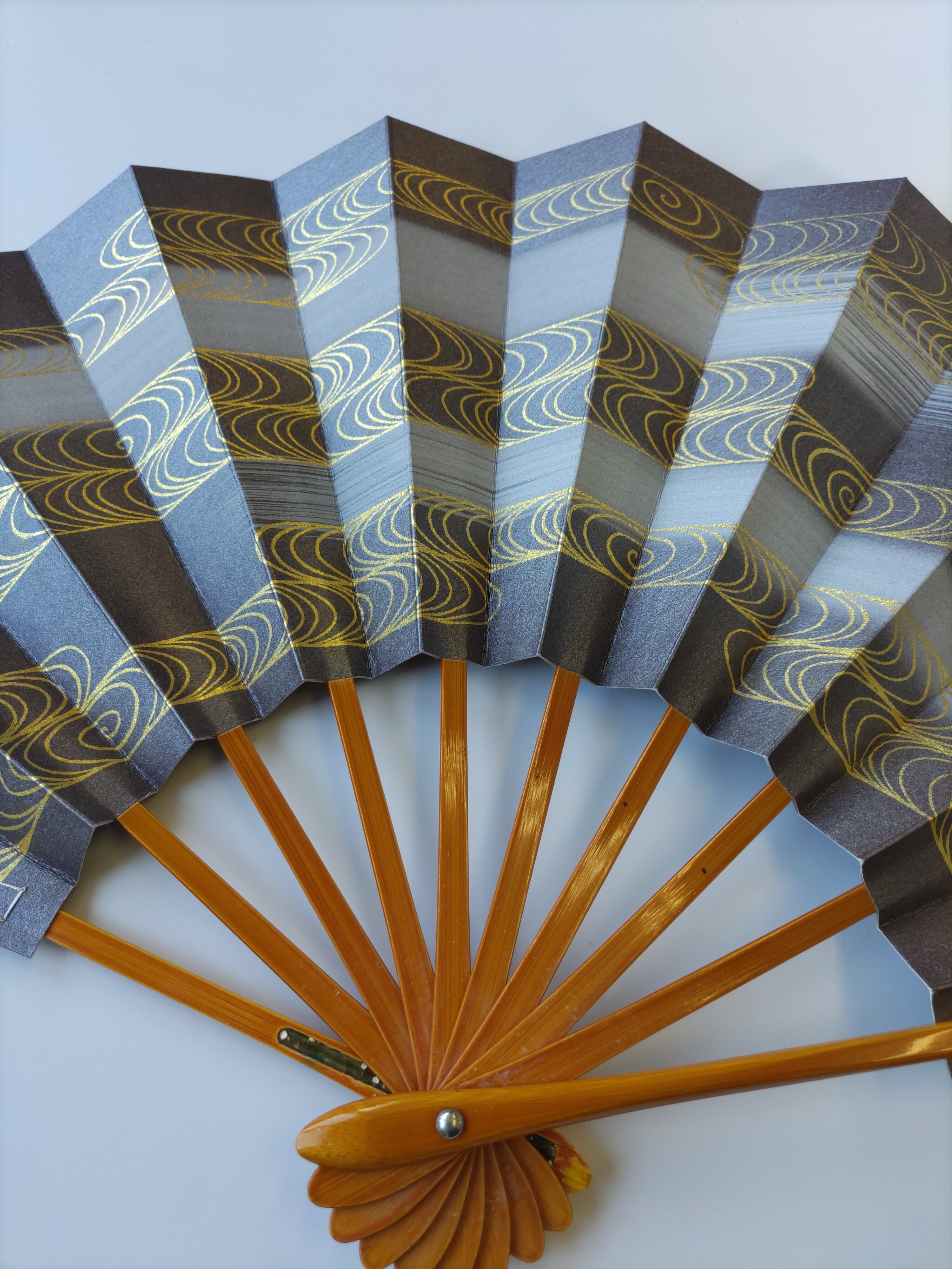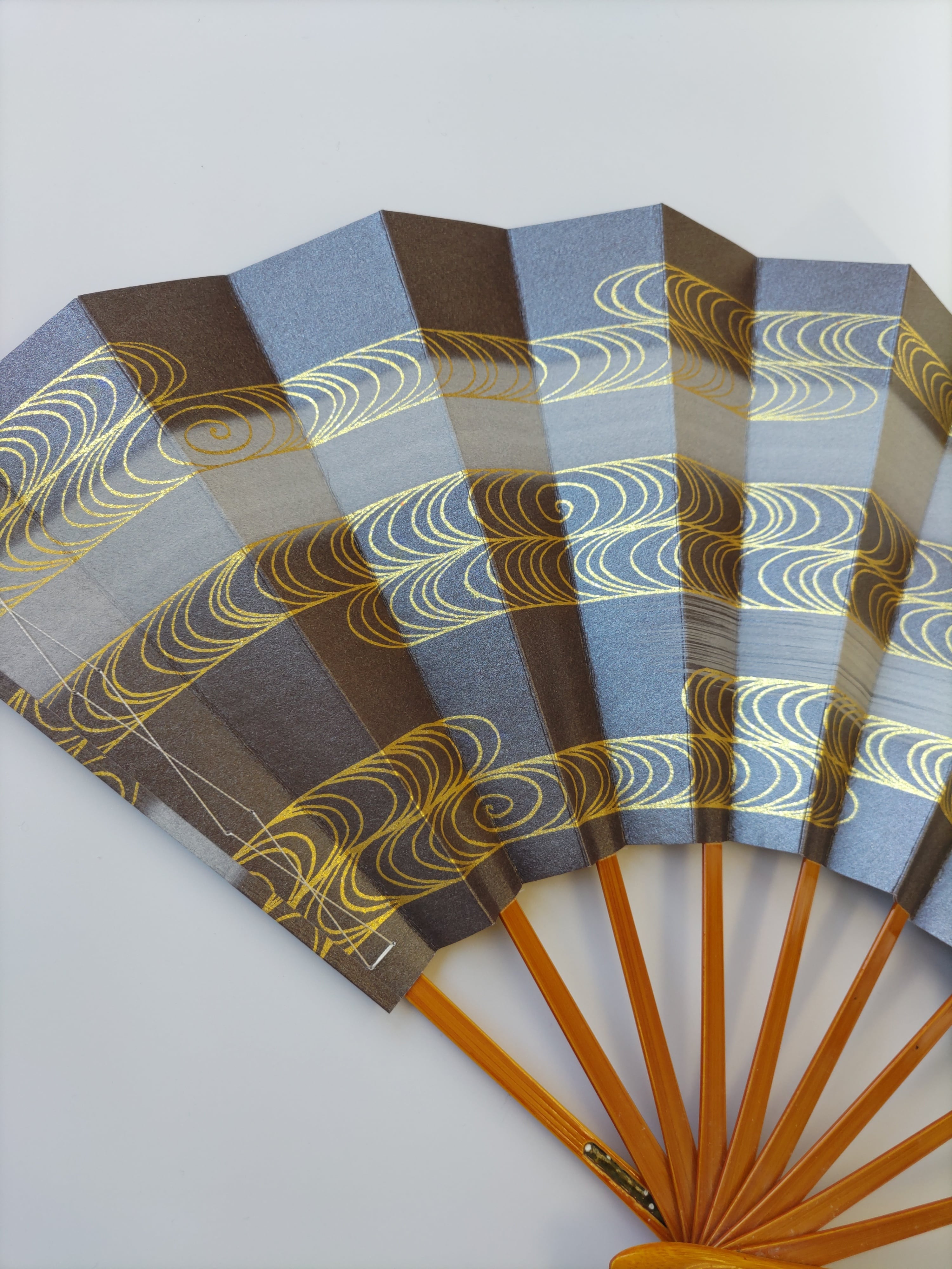 小豆色に金の観世柄が入った、両面同柄で春ケイ骨の当店オリジナルのお扇子です。サイズは9寸5分の大きさ(約29cm)で、お稽古、舞台でご使用いただける商品です。