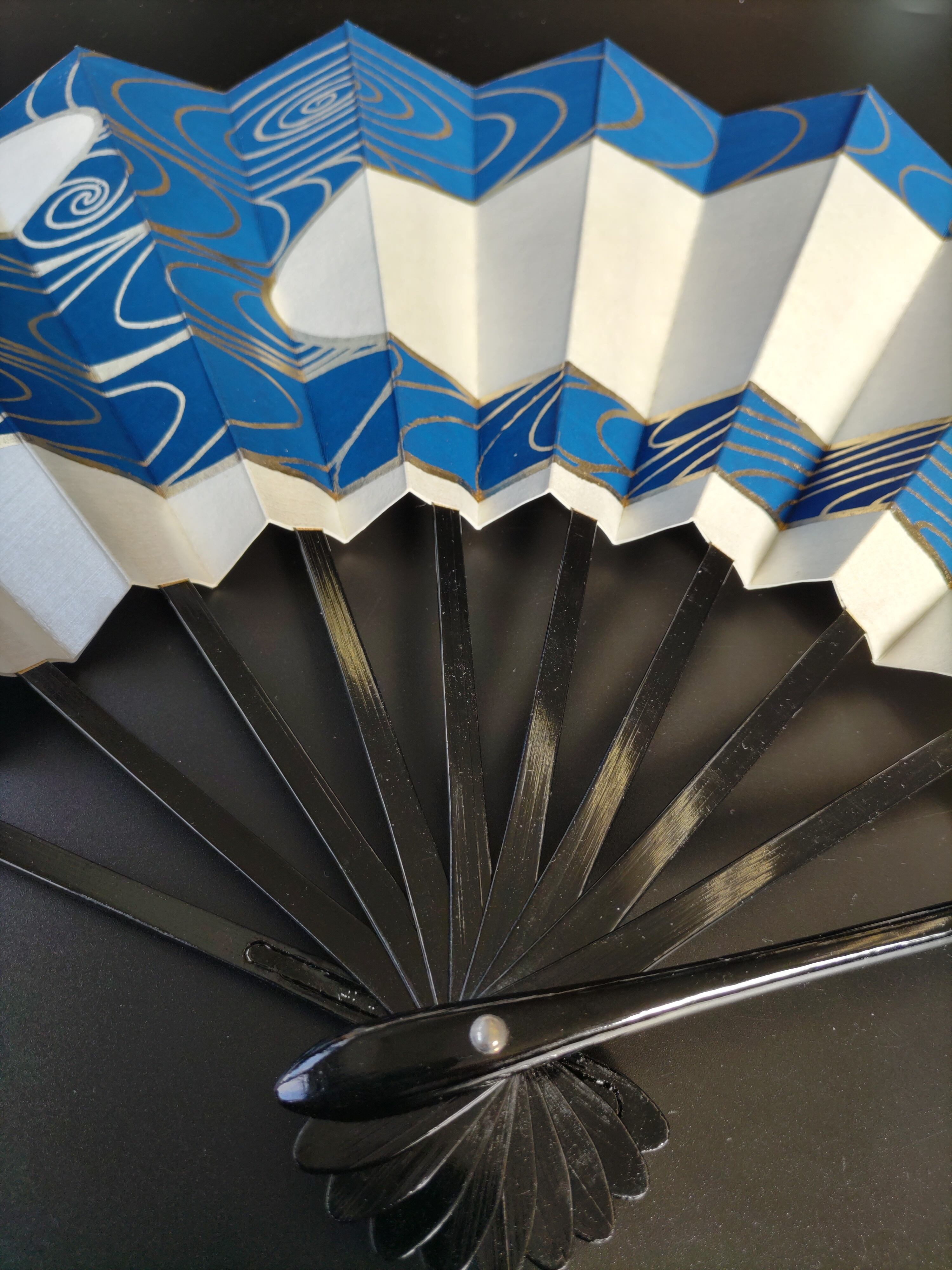 白地の紙に紺金の観世柄が入る、両面同柄で黒ヌリ骨の当店オリジナルお扇子です。サイズは9寸5分の大きさ(約29cm)で、お稽古、舞台でご使用いただける商品です。