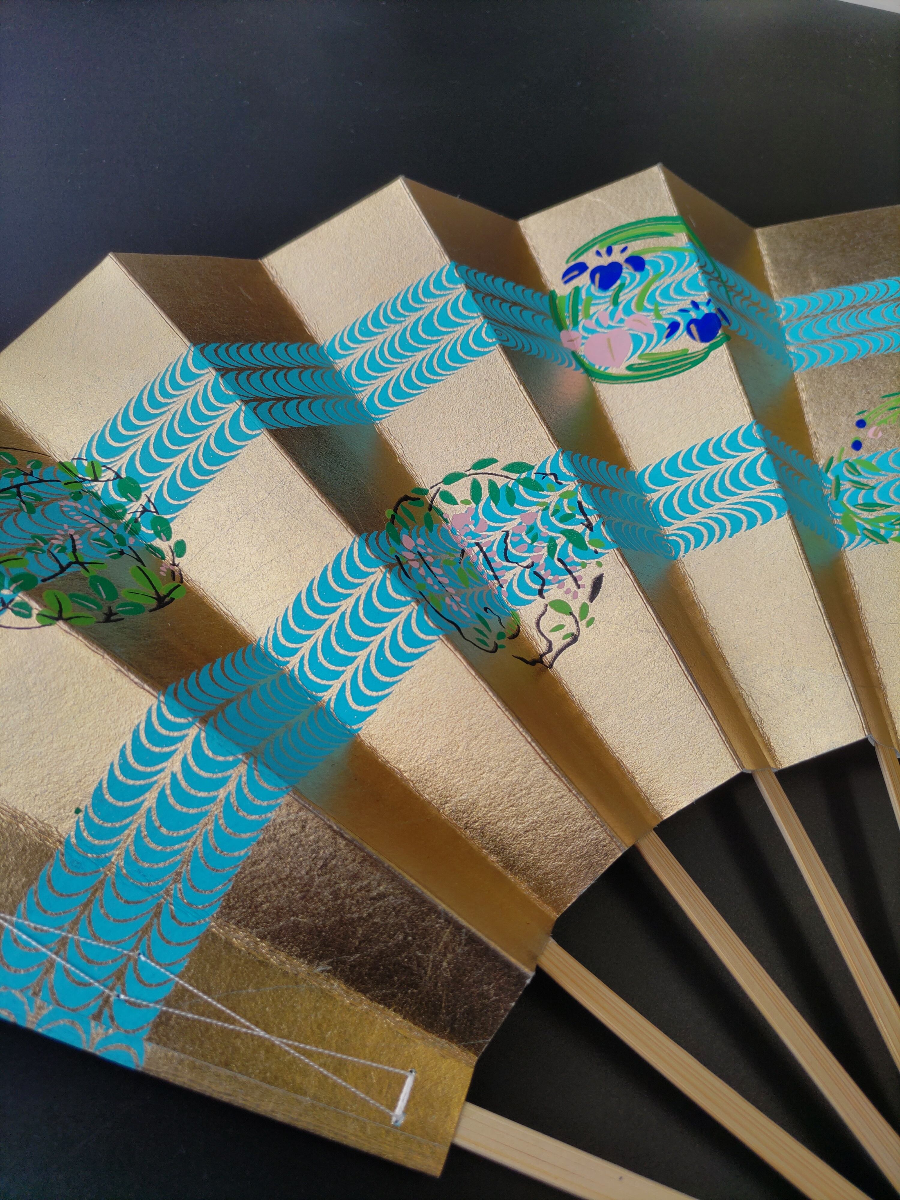 金地に水色の観世と花丸が入った、両面同柄のお扇子です。サイズは9寸5分の大きさ(約29cm)で、お稽古、舞台でご使用いただける商品です。プレゼントにもどうぞ♪当店オリジナル舞扇で骨は白竹。