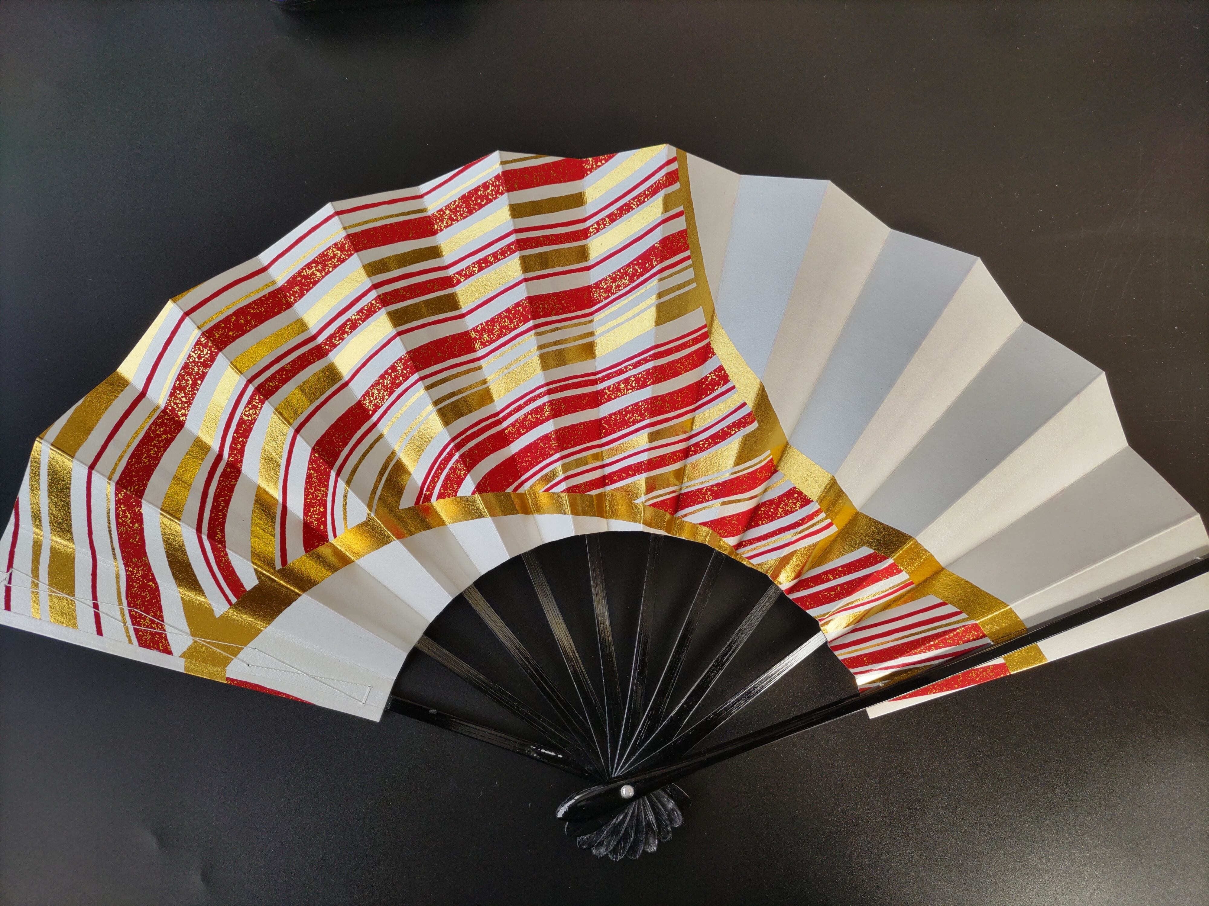 金、赤の縞模様が段々に入る、なかなか他では見られない両面同柄のお扇子です。