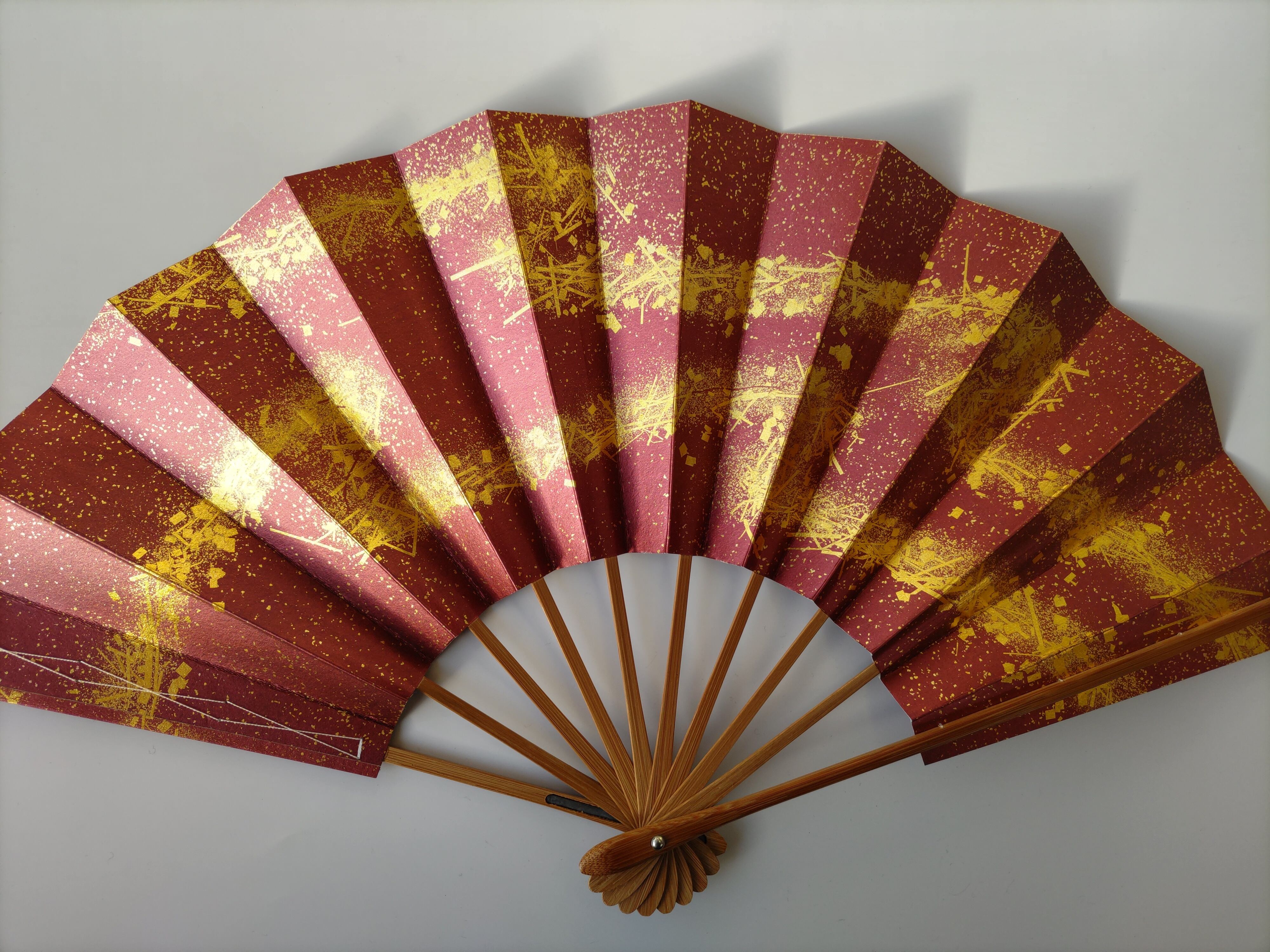 綺麗なワインレッドのような色合いに、金で二本の筋が入ることで舞台でも映える両面同柄のお扇子です。サイズは9寸5分の大きさ(約29cm)で、お稽古、舞台でご使用いただける商品です。プレゼントにもどうぞ♪当店オリジナル舞扇で骨はスス竹。