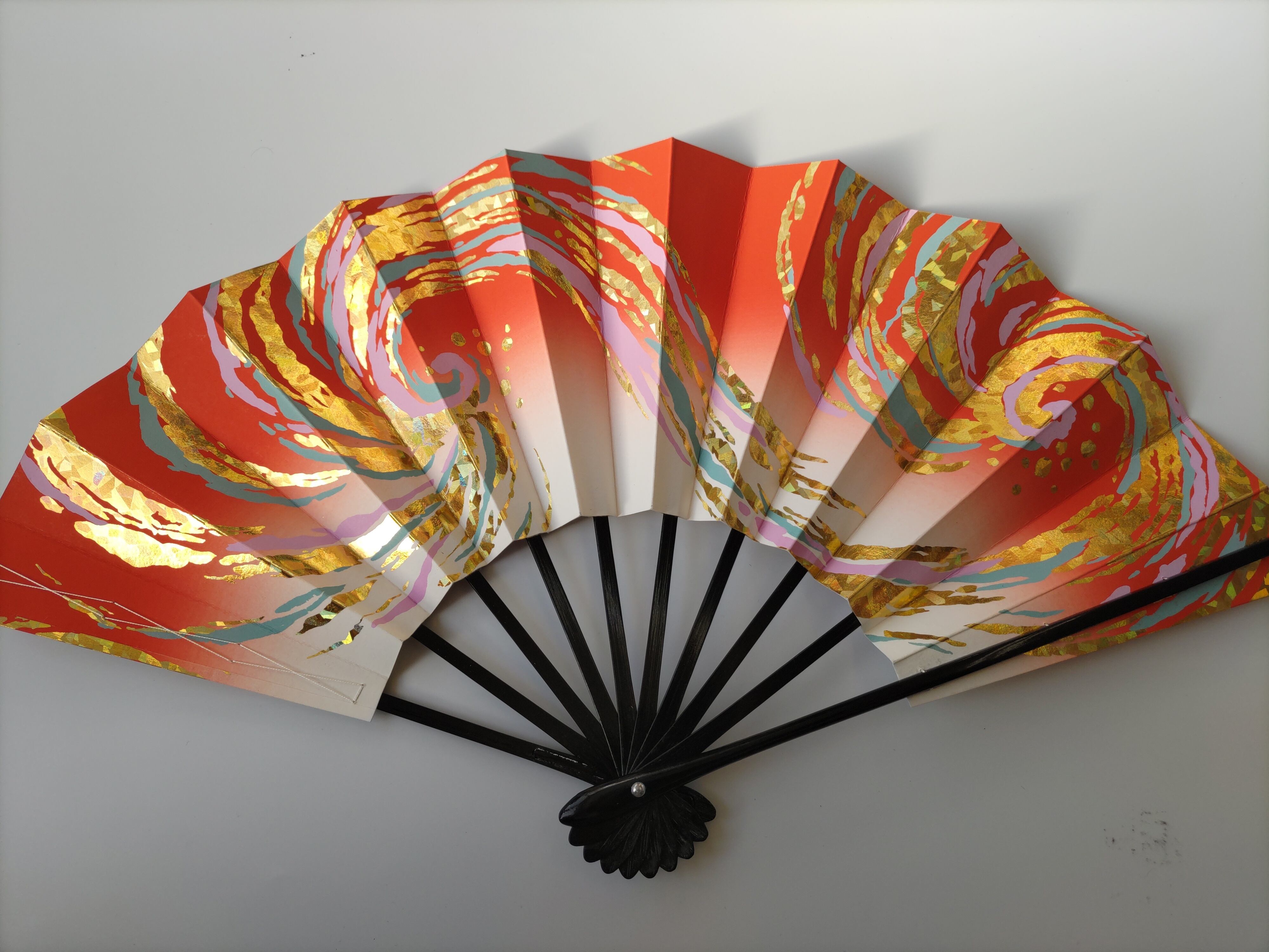 舞台で映える赤地に金のうずまき柄、両面同柄のお扇子です。サイズは9寸5分の大きさ(約29cm)で、お稽古、舞台でご使用いただける商品です。プレゼントにもどうぞ♪当店オリジナル舞扇で骨は黒ヌリ。