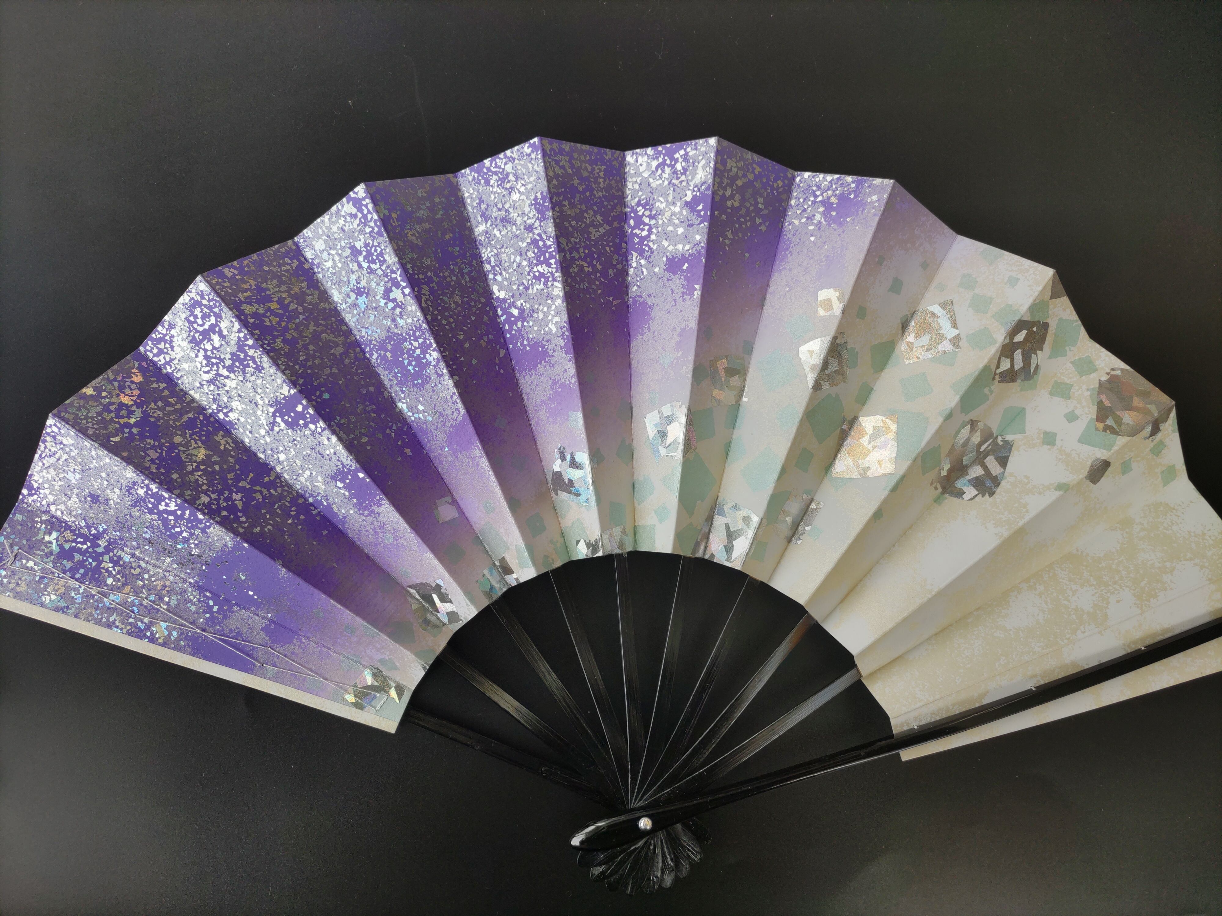 綺麗な藤色のぼかしにシルバーの箔が入った舞扇です。藤色とシルバーの色合いが絶妙で、発売当初から当店では人気の舞扇です(^^)