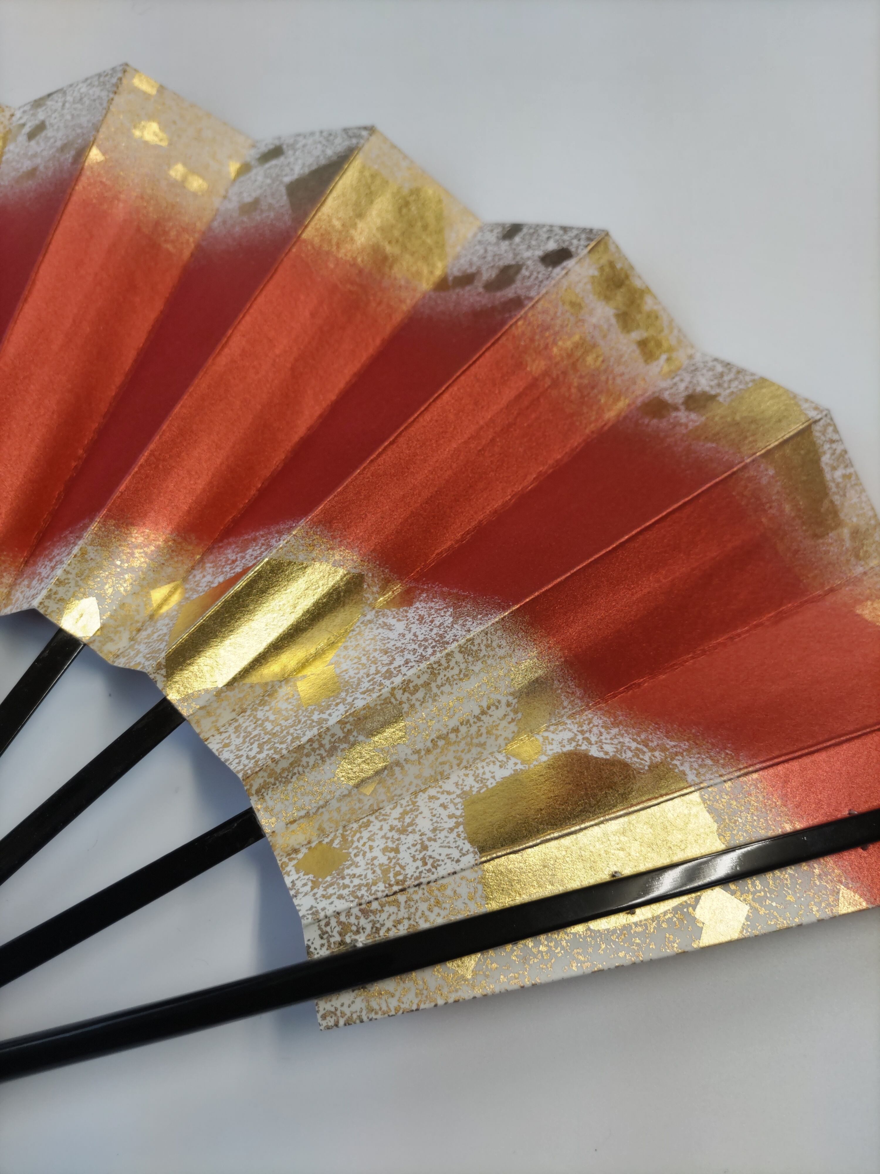 ギラっとした鮮やかな赤色の三方に、金の色紙柄が入った両面同柄のお扇子です。サイズは9寸5分の大きさ(約29cm)で、お稽古、舞台でご使用いただける商品です。プレゼントにもどうぞ♪当店オリジナル舞扇で骨は黒ヌリ。