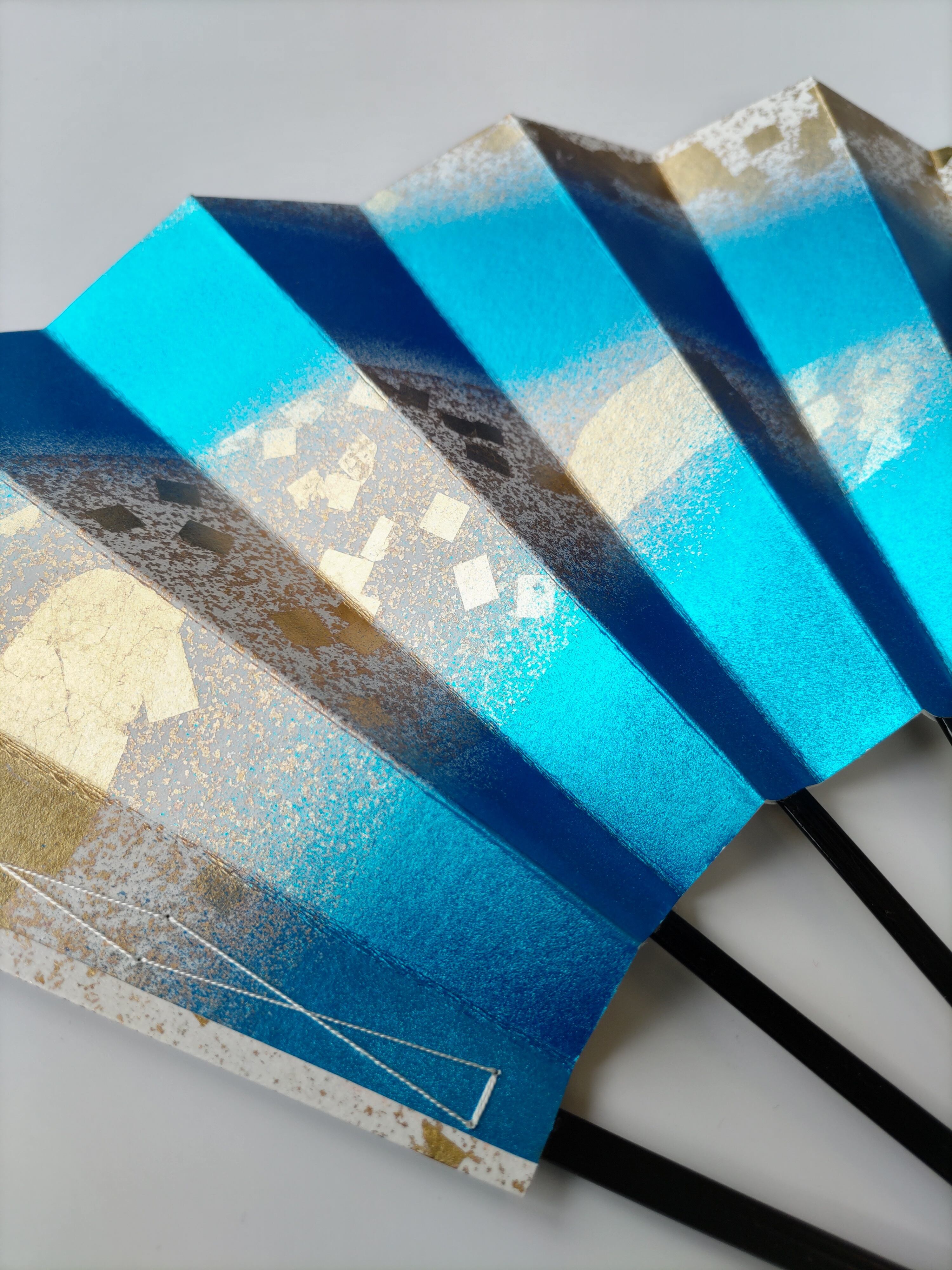 ギラっとした鮮やかなブルーの三方に、金の色紙柄が入った両面同柄のお扇子です。サイズは9寸5分の大きさ(約29cm)で、お稽古、舞台でご使用いただける商品です。プレゼントにもどうぞ♪当店オリジナル舞扇で骨は黒ヌリ。