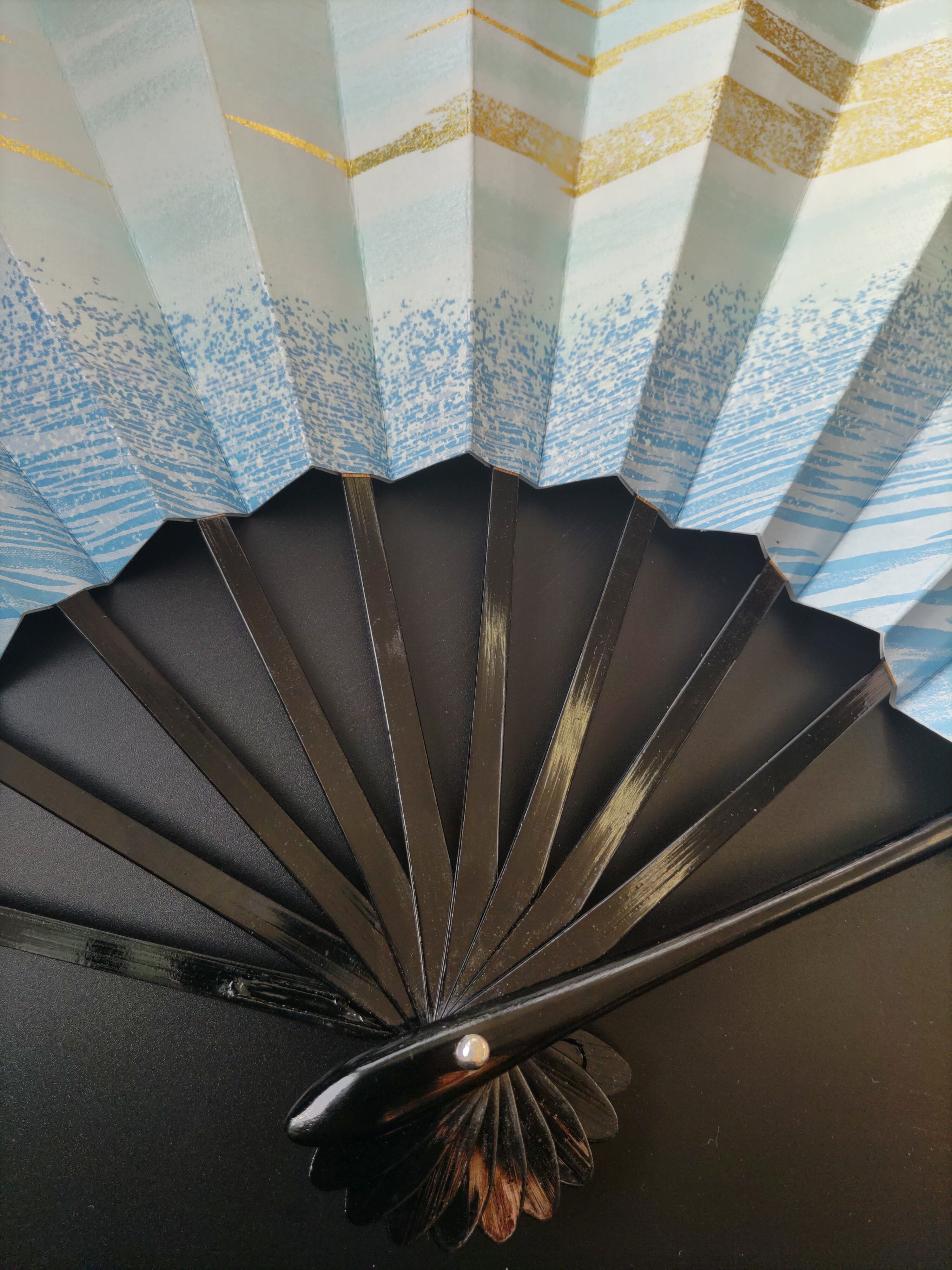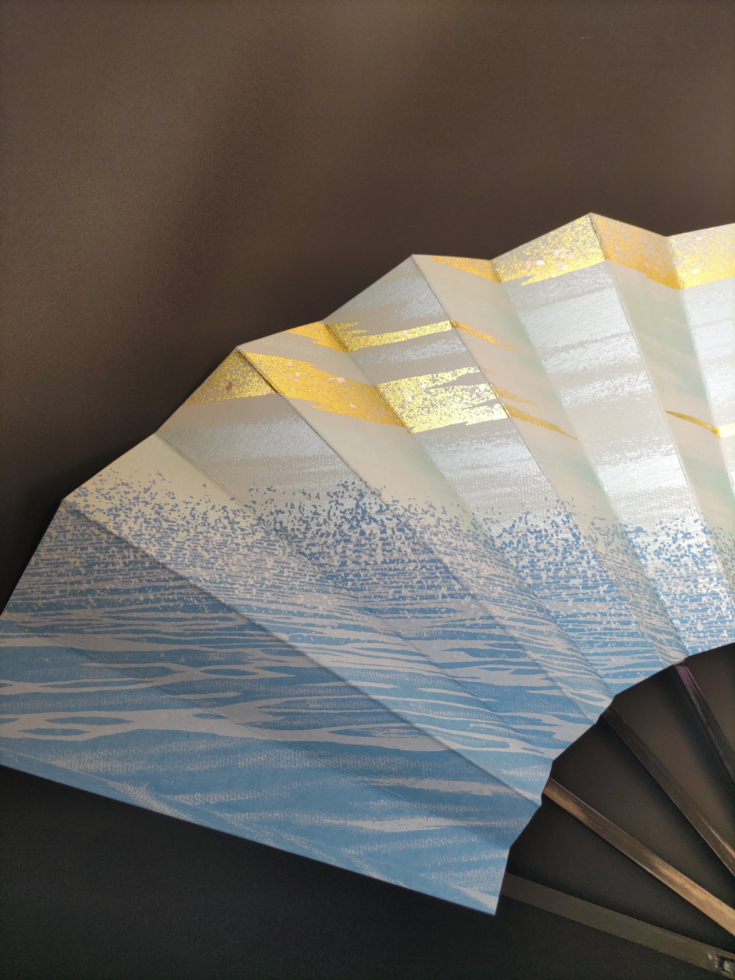 水色の水平線のような柄が入った、両面同柄のお扇子です。サイズは9寸5分の大きさ(約29cm)で、お稽古、舞台でご使用いただける商品です。プレゼントにもどうぞ♪当店オリジナル舞扇で骨は黒ヌリ。