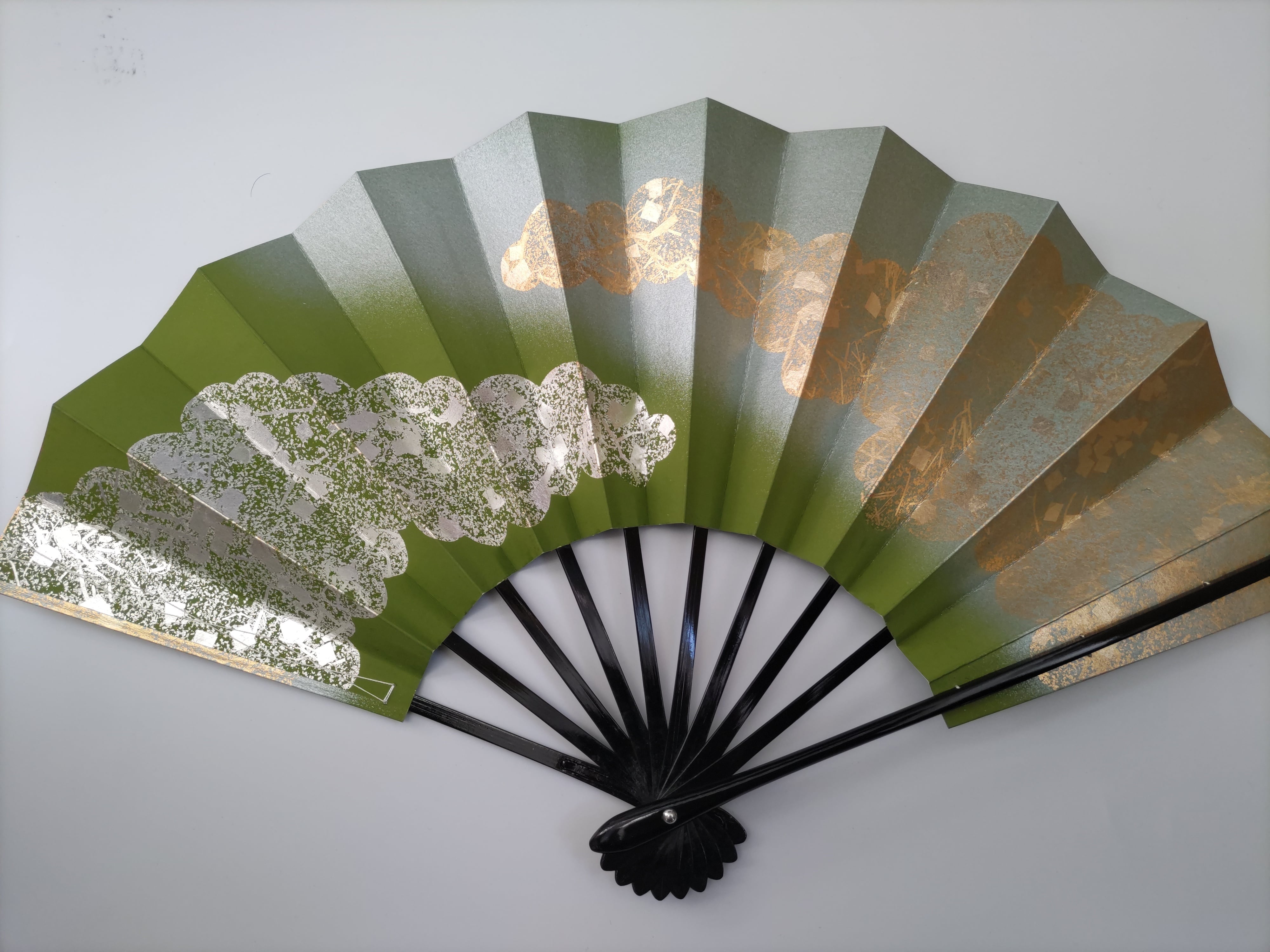 深い緑色に金銀の雲が入った両面同柄のお扇子。サイズは9寸5分の大きさ(約29cm)で、お稽古、舞台でご使用いただける商品です。プレゼントにもどうぞ♪当店オリジナル舞扇で骨は黒ヌリ。