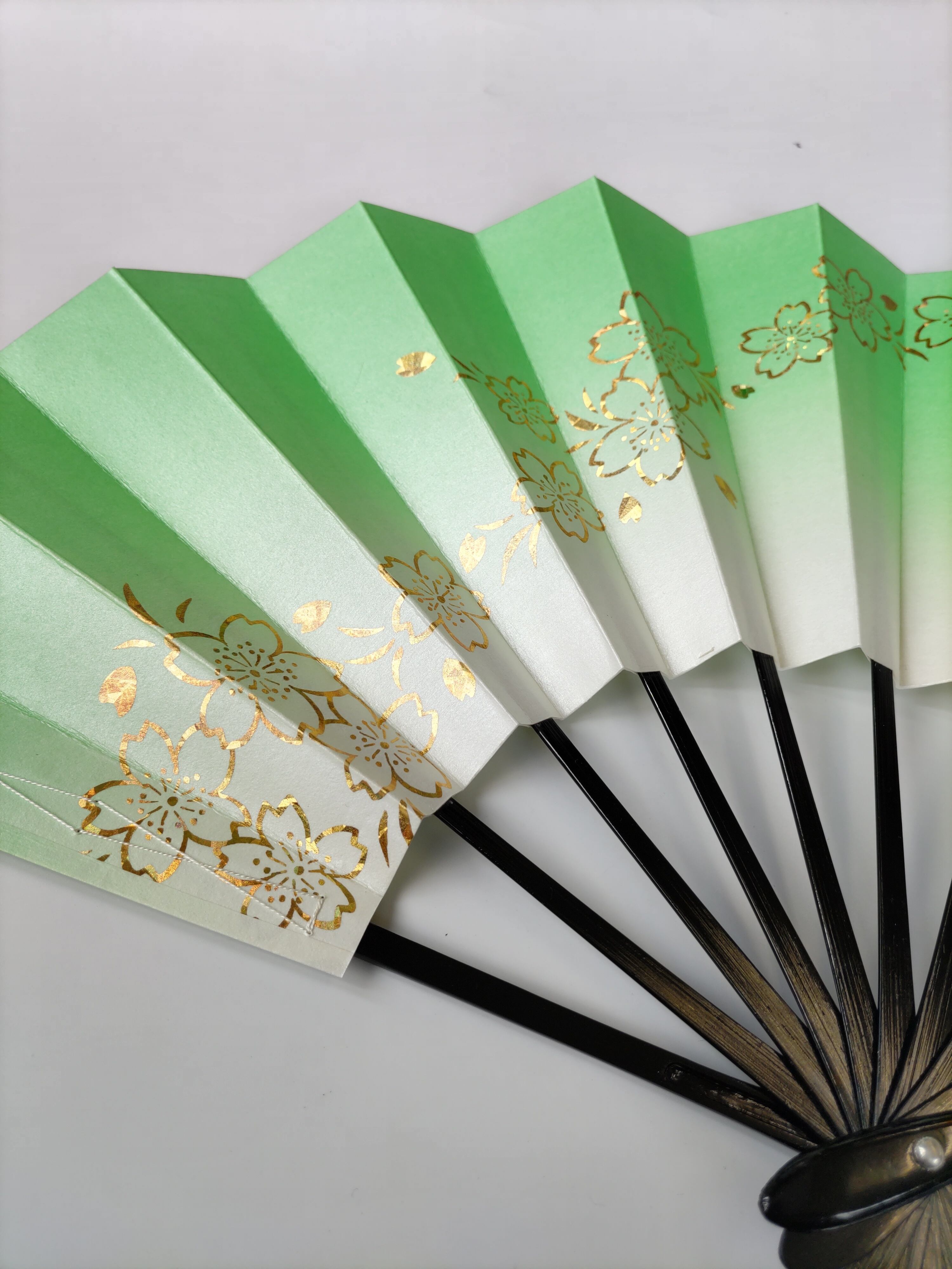 草色のパール地に金の桜柄が両面に入るお扇子。