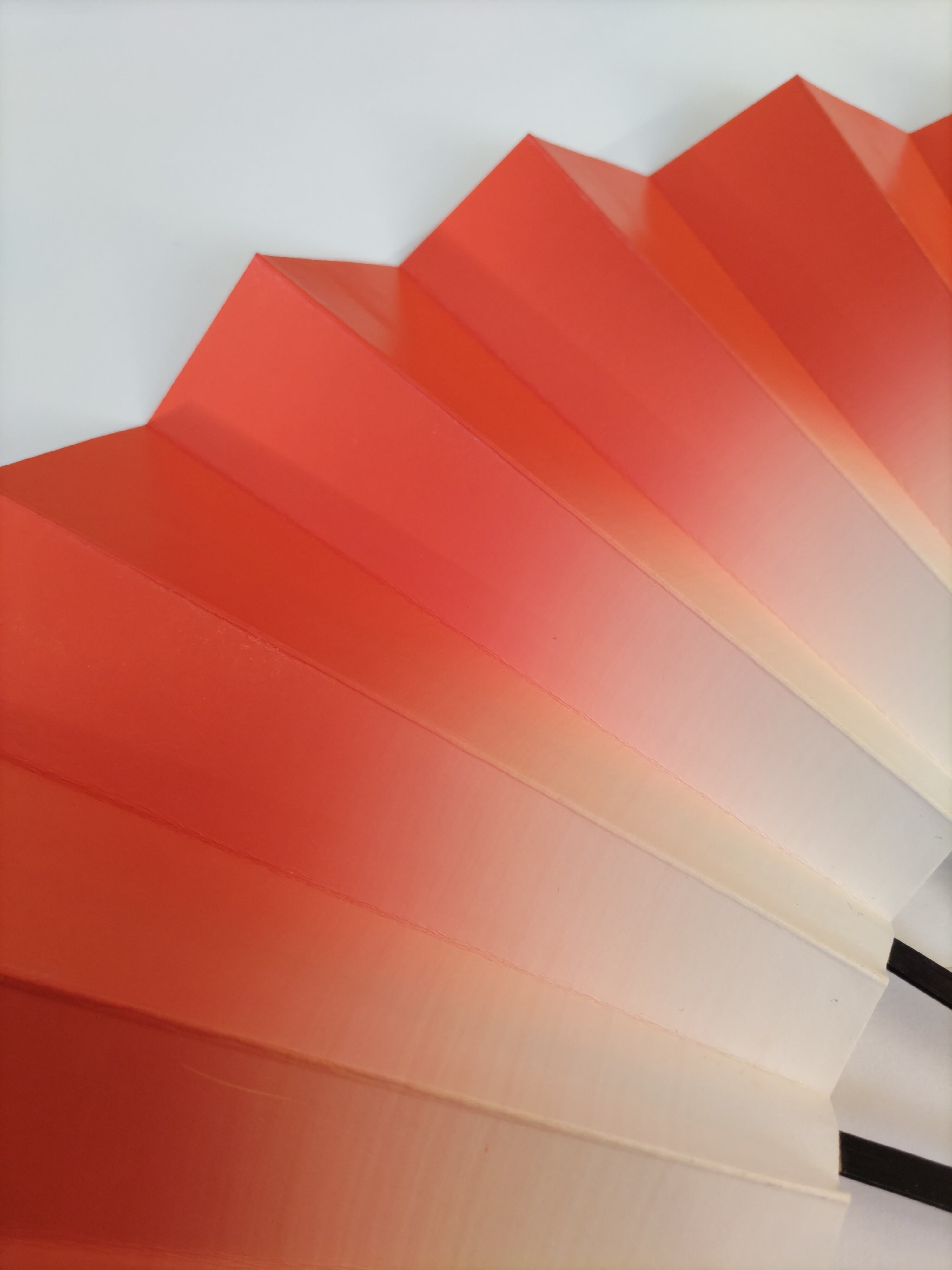鮮やかな朱色のボカシ柄、両面同柄のお扇子。